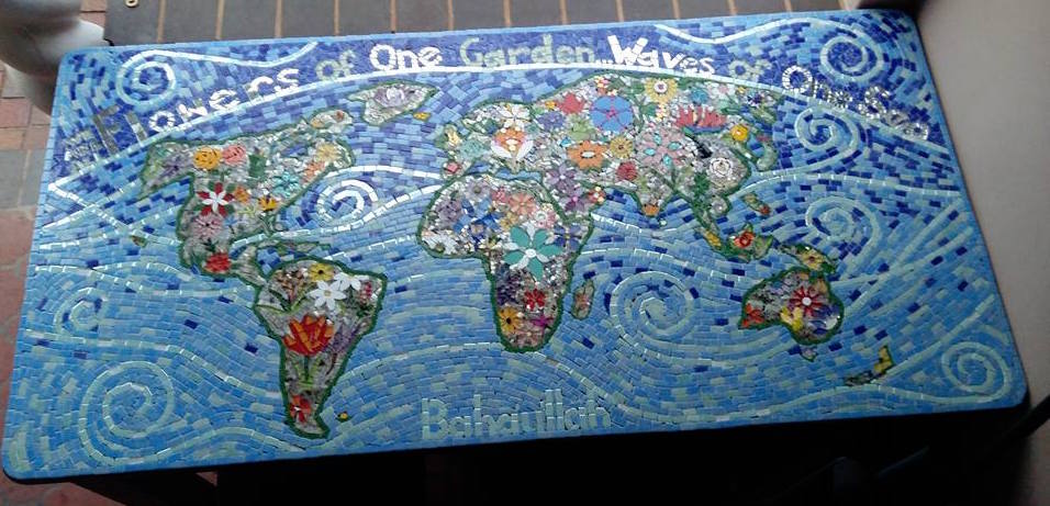 Organise a school art project! This beautiful piece is from Beaconsfield primary school in Western Australia. Two mothers approached the school principal and asked what we could do for the Birth of Baha’u’llah as this is a significant year for all Baha’is around the world. She suggested we do a mural for the school. Then, with collaboration with an artist friend (and parent at the school) they all came up with a design, then the teachers and art teacher coordinated the clay work. At their Baha’i camp at the school during school holidays, the kids got to glue the mosaics on.